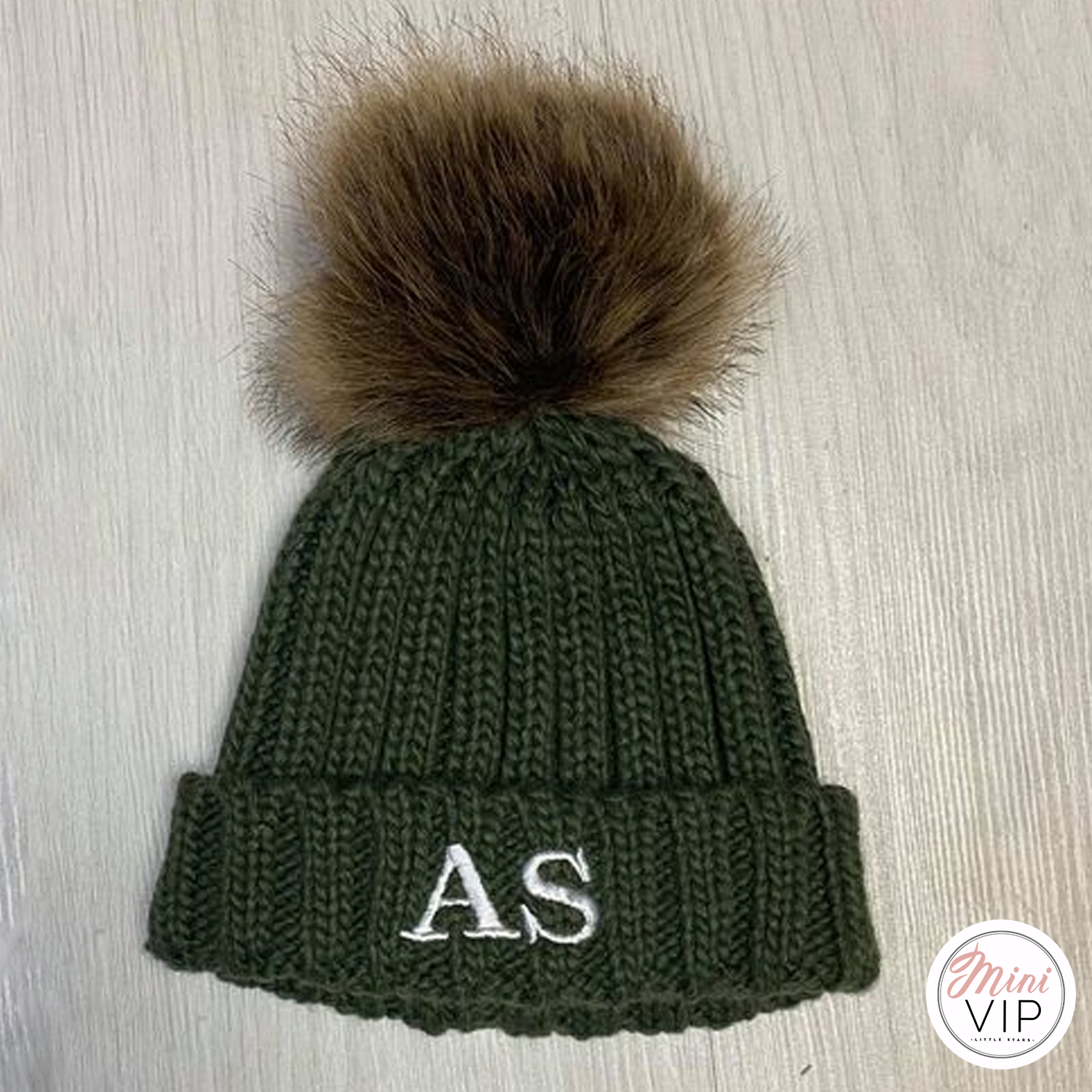Khaki Embroidered Cable Knit Beanie Hat - Infants, Junior & Adult sizes