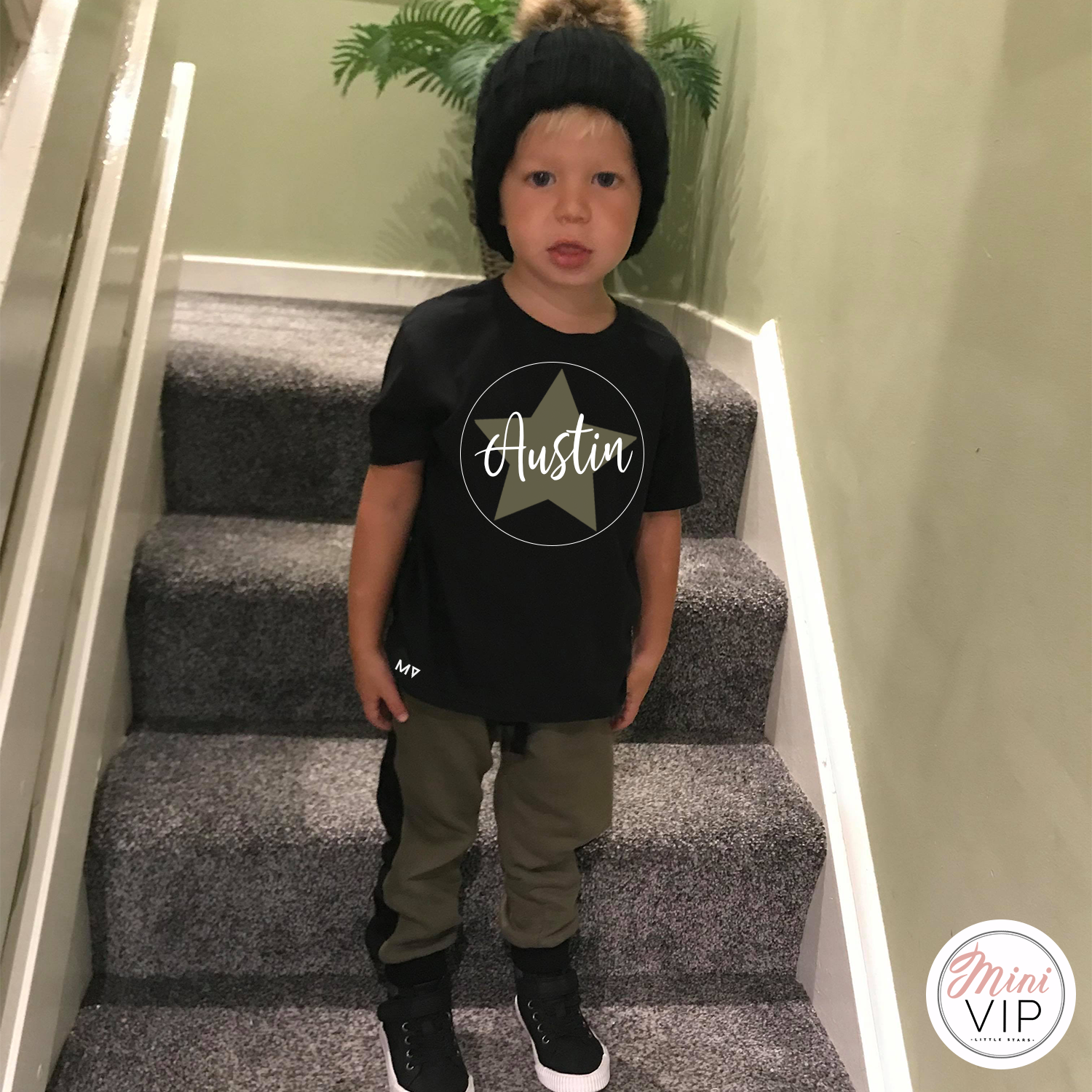 Black t-shirt & khaki/black stripe jog pants