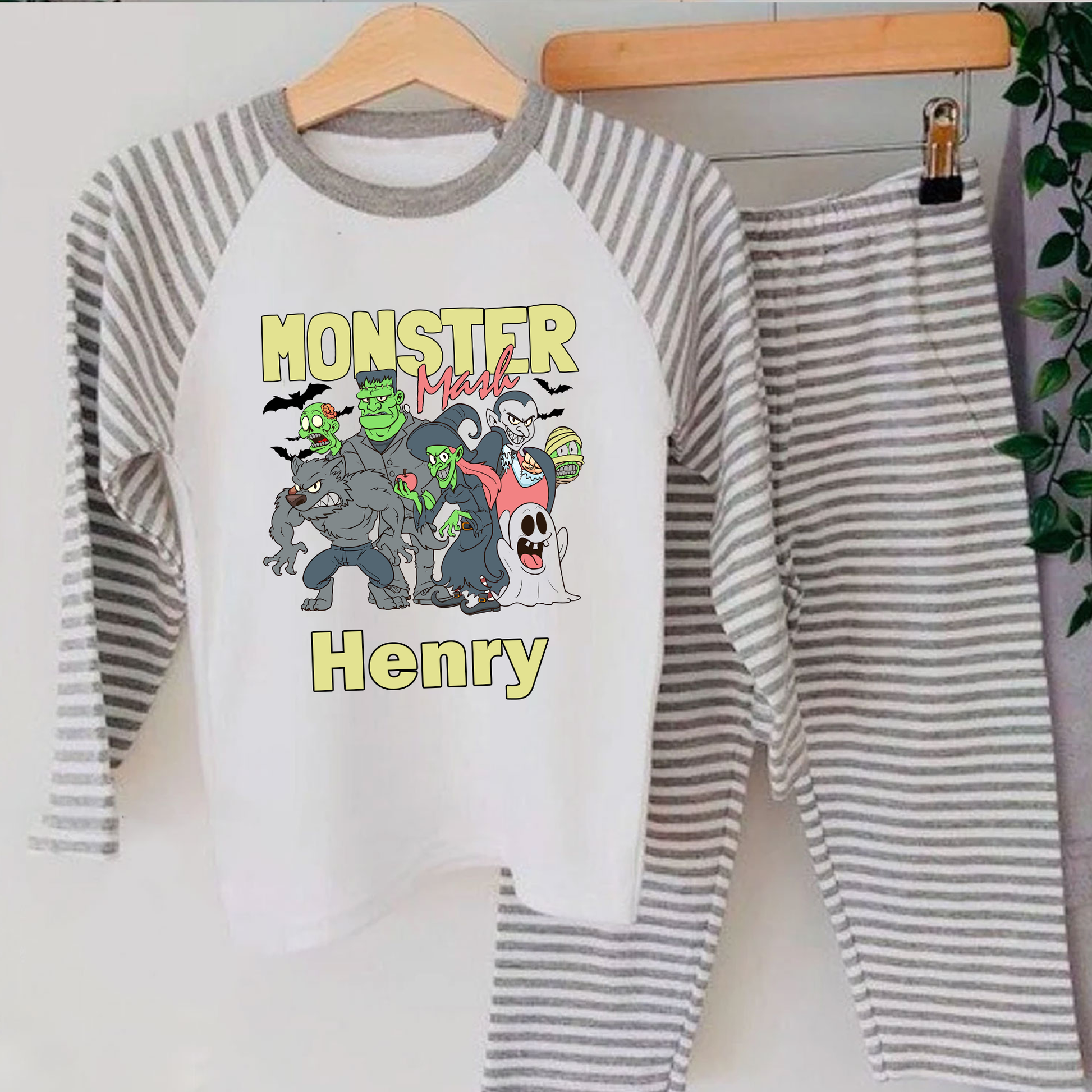 Personalised Halloween Monster Mash Grey Striped PJS Pyjamas