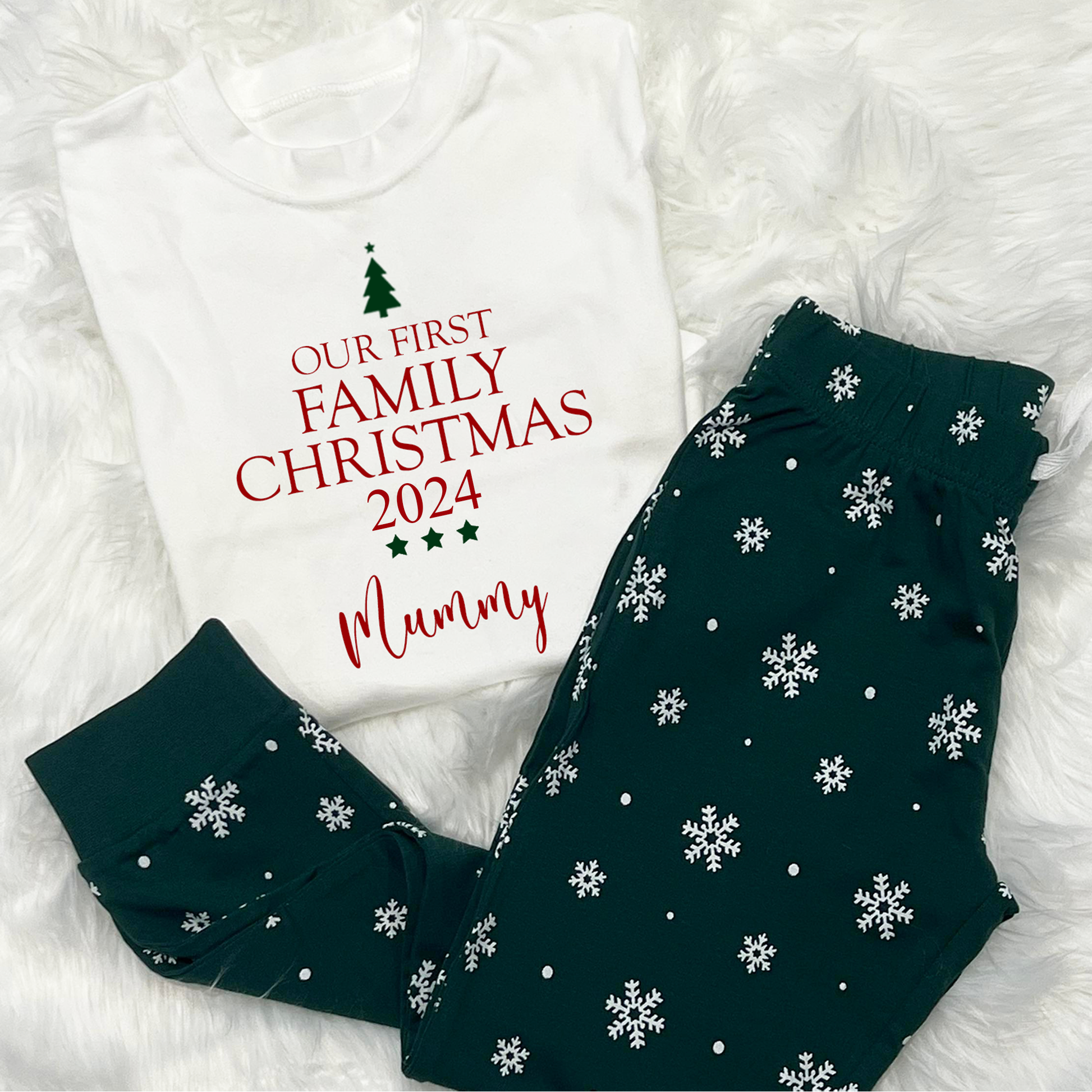 Personalised Our First Family Christmas Bottle Green Snowflakes Design Matching Christmas PJs