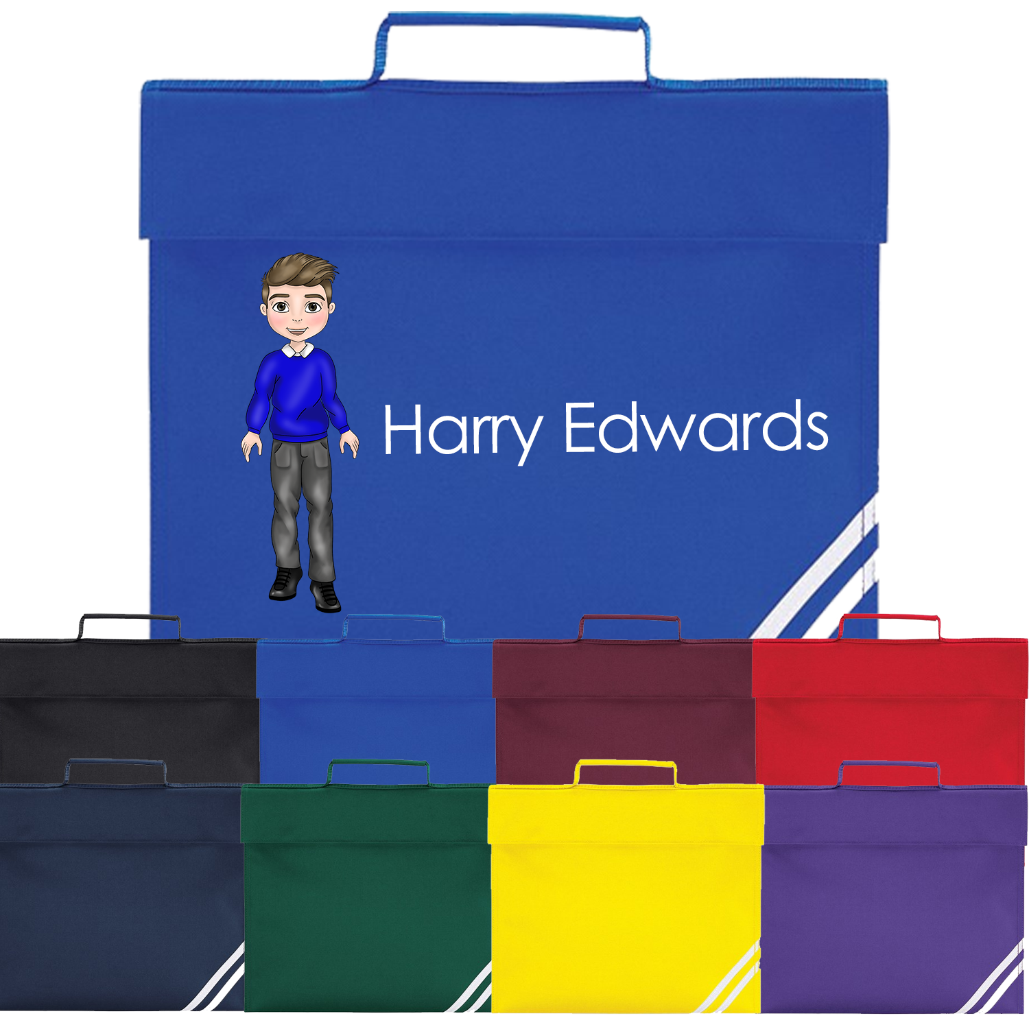 Personalised School Boy Character - Book/Homework Bag. Choice of colours & options