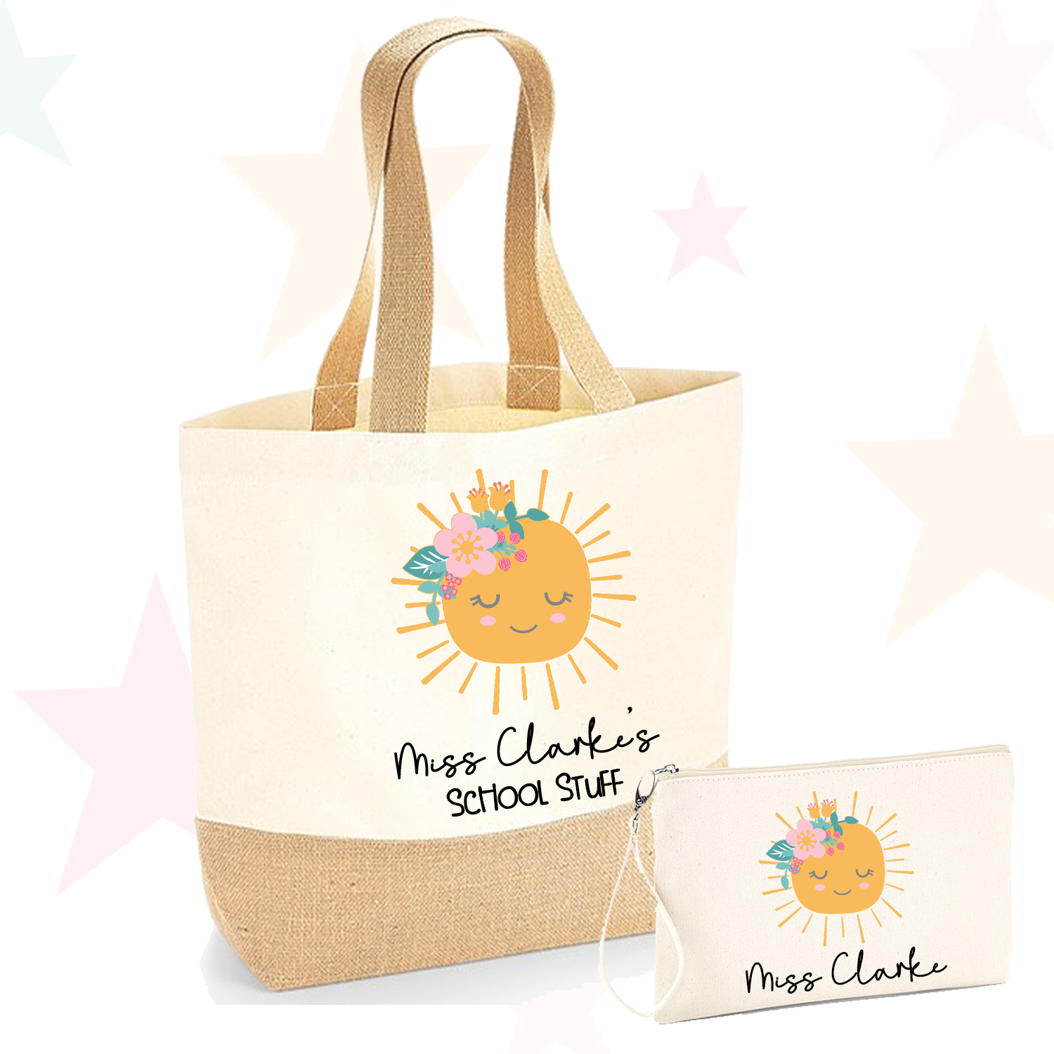 Personalised Sun Canvas Tote Bag / Wristlet Pouch- Set Option